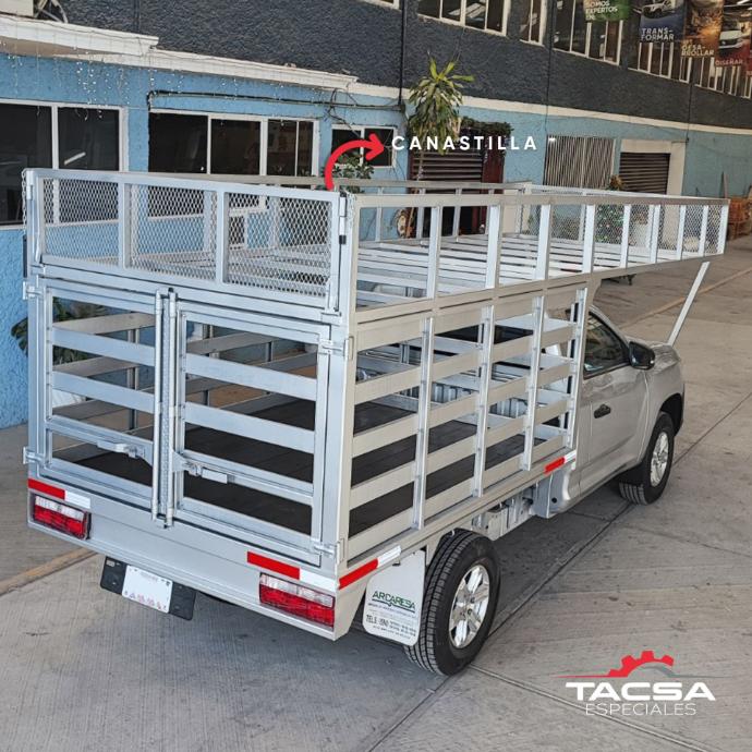 Carrocería con redilas y canastilla en forma rectangular con una capacidad efectiva de carga de 3,499 kg.