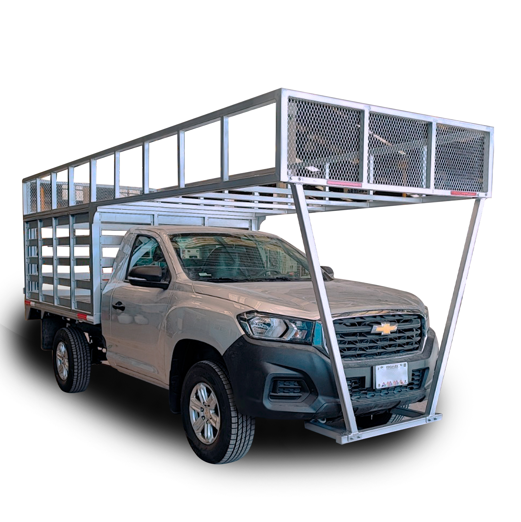 Vehículo de carga caracterizado por tener barandillas o estructuras de rejilla en sus lados.