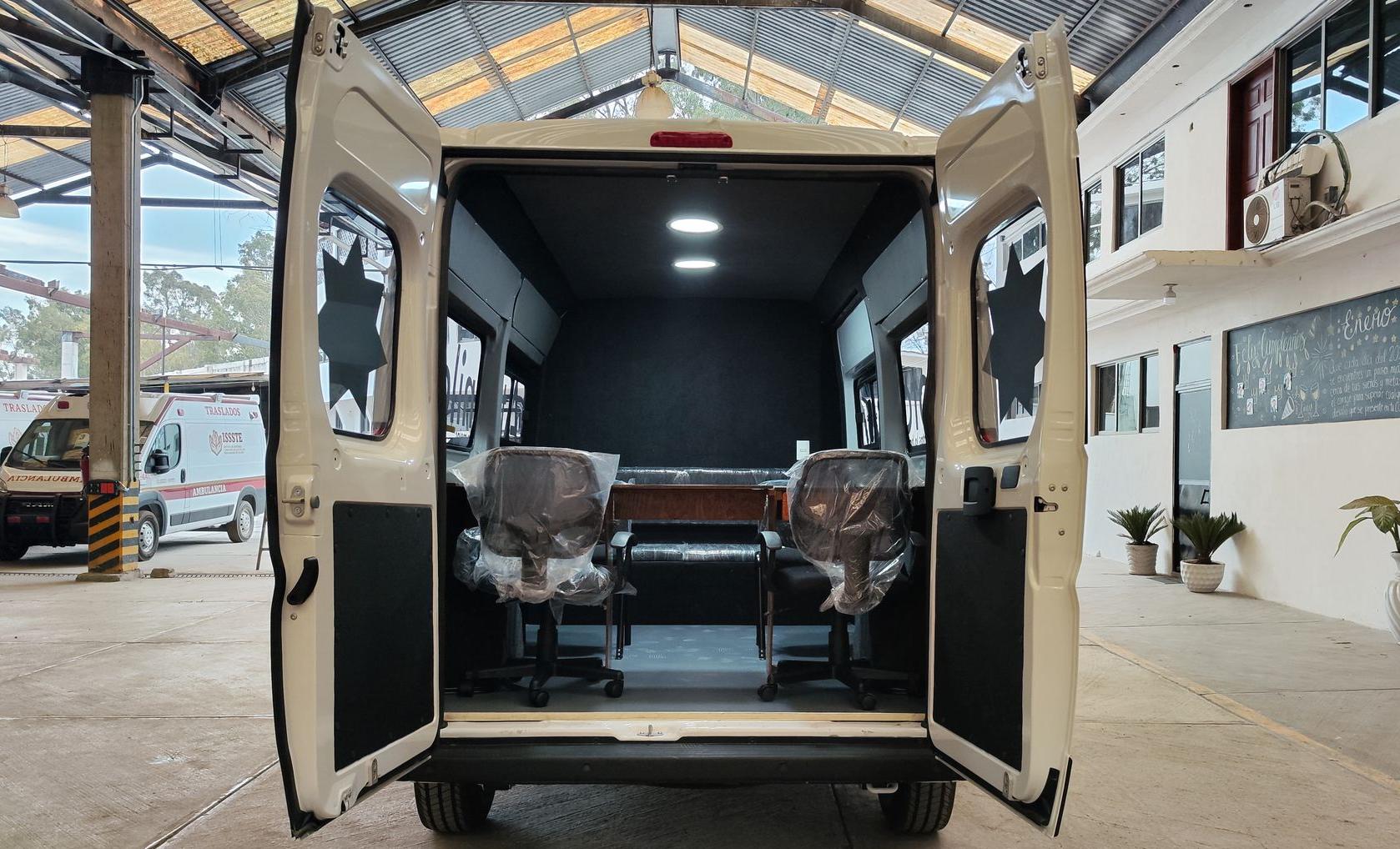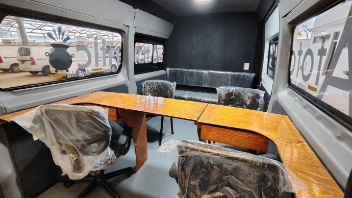 Incluye un escritorio fijo al piso del vehículo, mismo que cuenta con cajones y espacio para guarda de diversos.