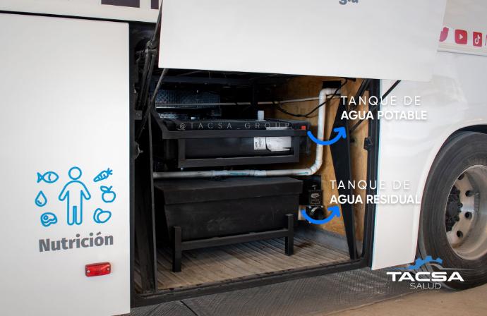 Equipada con bomba de agua, tanque de agua potable y tanque de agua residual.
